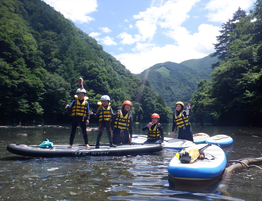ラフトボートと今話題のSUPで半日水遊び!大きなボートに乗って探検に出発!ボートの先端から飛び込んで遊んだり、プカプカ浮かんで空を眺めたり、ぐらぐら揺れるSUPにみんなで乗ればバランス勝負が始まります。遠くまでドンドン漕いでいくわけではないので、小さいお子様がいるファミリーにもおすすめのこのコース。ボート+SUPで2倍楽しいですよ!